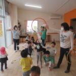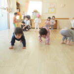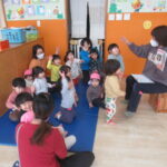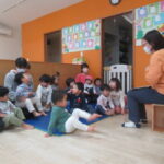 <お集まり> 色々な動物がウサギのお家に遊びに来る紙芝居を見ました。誰が来たのかな?とお友達に聞いてみると次々に教えてくれて、みんな真剣な顔で見ていました。 <リズム遊び> ピアノのリズムに合わせて簡…