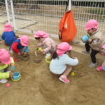 <シール貼り> シールを台紙から外すのも上手になってきてスムーズにシール貼りが楽しめる子が増えてきました。たくさん貼って嬉しそうに見せてくれます。重ねて貼ったり、台紙の絵に丸が描いてあるところに貼った…