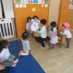 <だーれかなー?> かくれんぼしている動物のあてっこをして、その後みんなの名前を呼びました。最近お友だちの名前を覚えて呼び合う姿が増え、名前を呼ばれたお友だちを「ここにおるよー!」と教えてくれたり仲間…