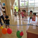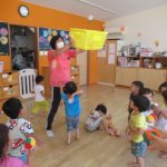 <おはよう!> ペープサートでいろんな色の風船のうたを歌いながら、色のイメージから裏に描かれている絵(野菜や果物)が何かを当てっこしました。みんなたくさん当てていてビックリでした!最後に描かれている食…