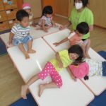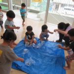 <ぶどうを作ろう> 9月の壁面制作のぶどうを作りました。ペットボトルのふたで作ったハンコをペタペタ押していきます。ぶどうの実のような紫色の丸が出てくると嬉しくて、たくさん押しました。 <プールで遊ぼう…