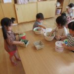 <ぶどうを作ろう> 9月の壁面制作では、ペットボトルキャップのハンコでぶどうを作っています。紫色の絵の具をつけて画用紙にペッタン。完成したら壁面に飾りますのでお楽しみに♪ <真似っこ出来るかな?> 絵…