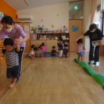 <お集まり> 「ぴょーん」の絵本を見ました。カエル、うさぎ、バッタたちがぴょーん!とジャンプをします。どんぐりさんも絵本を見て真似をして「みて!わたしも跳べるよ!」と跳んで見せてくれました。 <魚をつ…