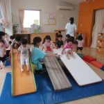 <お集まり> 今日は8名のお友達。ゆったり遊びました。いつものお集まりでは、賑やかでお友達の返事も聞こえない程ですが、周りのお友達が静かに聞いてくれていて、大きな声で返事をしてくれたので、大きな返事が…