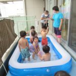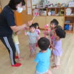 <今日も元気!> 月曜日の朝。元気な声がたくさん聞こえてきました。お集まりで一人ずつ名前を呼んだ時も「ハイ!」と元気な返事。暑さに負けずこの調子で過ごして欲しいです。今日はネズミくんシリーズのおばけの…