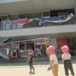 <大好き こいのぼり> 鯉のぼりが大好きになった子どもたち。今日は鯉のぼりの形に切った色画用紙にシール貼りをしました。シールを貼っていくと、かわいい鯉のぼりができました。持てるようにストローに付けると…