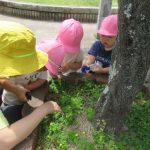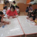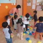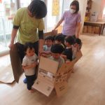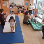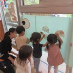 <だるまさんが⁈> 朝のお集まりで『だるまさんが転んだ』のペープサートをしました。手を横にピーンと伸ばしてペープサートのだるまさんの真似っ子がとっても上手です。「だるまさんが〜…ドテ〜」と言うと寝っ転…