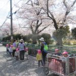 <お花見しながらお散歩🌸> 今日も早くにお片付けをして、早めに散歩に出掛けました!桜もチューリップも綺麗に咲いていたので、寄り道をしてみんなでゆっくり見て楽しみました♪「ゆきみたい〜!」「綺麗だねー」…