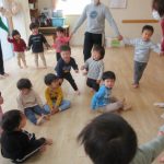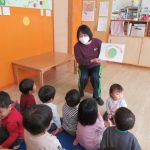 〈やおやさん〉 八百屋のお店の手遊びをしました。八百屋は野菜を売っているお店ということを話してから、八百屋のお店に並んでいる野菜はあるかな?みんなに聞くと、「とまと・きゅうり・かぼちゃ・ほうれん草」な…