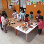 <〇〇食べてきた!> 朝のお集まりで、おままごとの食べ物を使ってクイズをしました。みんな、朝ごはんの話題になると、聞いて聞いてと言わんばかりに口々に話し始めました。しっかり朝ごはんを食べてきたのだな~…