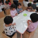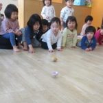 <ヤッター!回ったー> 朝のお集まりで、コマを回しました。紐を巻いて回すコマなので、少し珍しく見えたようです。子どもたちが真剣に見つめていたので、内心ドキドキしましたが久々のコマも上手く回りました。「…