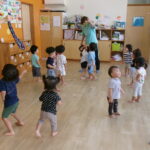 〈あっぷっぷでへんなかお〉 みんなでにらめっこをすると、一生懸命に面白い顔をする子どもたち(^^)保育士に負けじと面白い顔をたくさん見せてくれて、部屋が笑い声であふれました(^^) 〈ぶらぶらぶらさが…